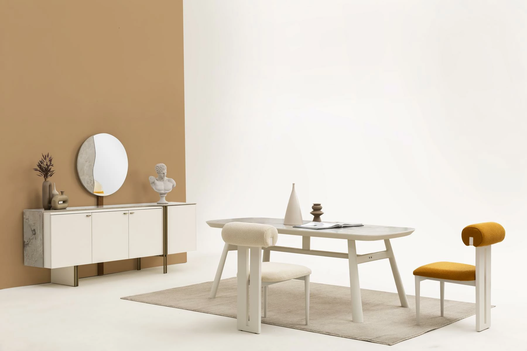 Modern çizgilerle tasarlanan Puffy yemek odası takımı, minimalist detaylarla zenginleştirilmiştir. Temiz hatları ve zarif görünümüyle her zevke hitap eden bu takım, evinizin dekorasyon tarzına kolayca uyum sağlar. Farklı renk ve kaplama seçenekleriyle kişiselleştirme imkanı da sunmaktadır. Kaliteli malzemeler ve özenli işçilik, takımın uzun yıllar boyunca ilk günkü görünümünü korumasını garanti eder.